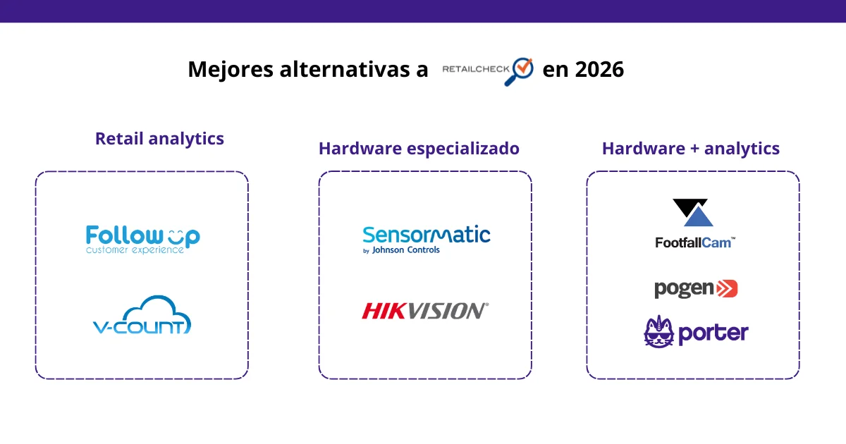 Las principales alternativas a RetailCheck en conteo de personas y soluciones integradas son: Porter, V-Count, Footfallcam, FollowUpCX, Pogen, Hikvision y Sensormatic.