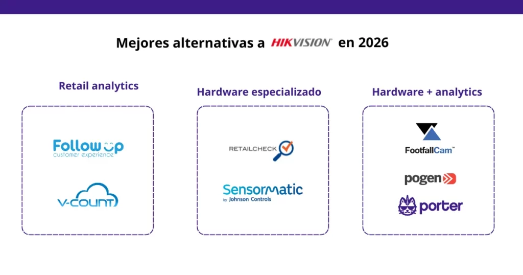 Existen varias soluciones de conteo de personas en el mercado, cada una con un enfoque distinto según el tipo de operación, el presupuesto y la región. Esta guía compara las principales alternativas a Hikvision para que puedas evaluar cuál se adapta mejor a tu negocio, sin sesgos ni lenguaje de ventas.